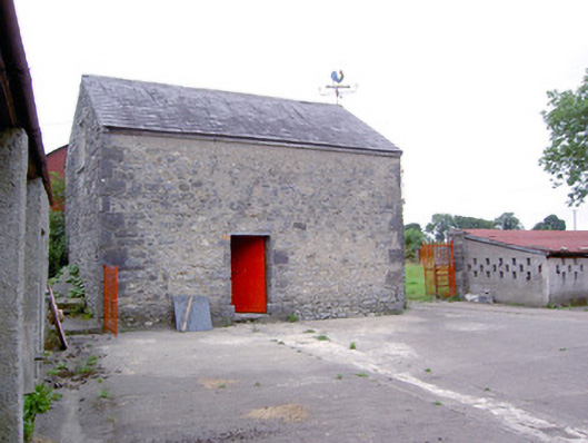 Complex of single- and two-storey outbuildings associated with Newtown House (13402403), built c. 1820 and c. 1870 arranged around a courtyard to the north of the main building. Detached multiple-bay two-storey outbuilding to south, built c. 1870, having pitched natural slate roof with brick chimneystack to west gable end. Roughcast rendered finish over random rubble walls with cut limestone eaves course. Square-headed window openings to north elevation with metal lattice windows and cut stone sills. Square-headed door openings to north elevation and at second floor level of west elevation, having sheet metal doors. Segmental-headed carriage–arch opening to south elevation, in grounds of house, having chamfered limestone voussoirs and surround, with prominent chamfered impost stones. Detached multiple-bay two-storey outbuilding to north of yard, built c. 1870, having exterior random rubble limestone staircase to southeast gable end having cut stone steps and cast-iron railings. Pitched natural slate roof with cut stone eaves course and with wrought-iron weather vane over gable apex to southeast. Random rubble limestone walls, partially rendered, with flush roughly dressed limestone quoins to corners. Clock face set in southeast gable apex having red brick surround. Square-headed window opening to northwest gable end with metal-framed casement window. Square-headed door openings with sheet metal doors. Open single-storey outbuilding, c. 1820, to west of yard having pitch corrugated-metal roof with raised rendered verges, pebbledashed walls, and square-headed openings. Random rubble boundary walls to east (road-frontage) and to northeast of site, formerly walls of outbuildings. Gateway to the east comprising a pair of wrought-iron flat bar gates. Rubble limestone boundary walls and wrought-iron gates to site. Modern barrel-vaulted barn to the northwest. Located to the north of Newtown House (13402403) and to the east of Legan.