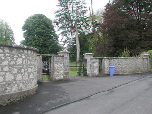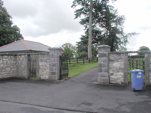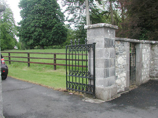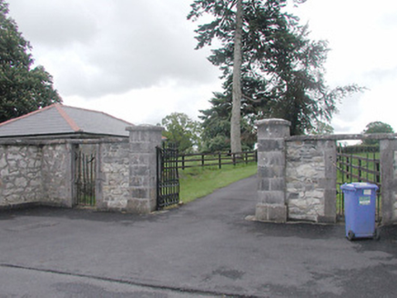 Gateway serving Moigh/Moygh House (13402606), built c. 1822, comprising a central pair of ashlar limestone gate piers (on square-plan) having projecting ashlar limestone plinths, capstones, and a pair of cast-iron gates with fleur-de-lis finials. Gateway flanked to either side (east and west) by square-headed integral pedestrian entrances having dressed ashlar limestone block-and-start surrounds, cut stone lintels and wrought-iron gates. Sections of rubble stone boundary wall (formerly rendered) on curved plan to either side having cut stone plinths and coping, and terminated by rubble stone gate piers (on square-plan). Single-storey gate lodge to the southeast side of gateway having modern hipped roof, rubble stone walls and square-headed openings with brick surrounds and modern fittings. Located to the northeast of Moigh/Moygh House (13402606) and to the west of Ballymahon.