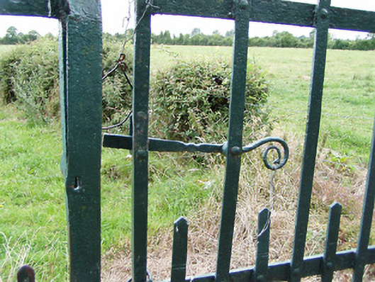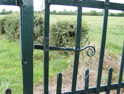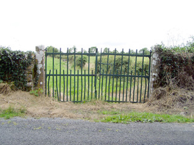 Vernacular field gate, erected c. 1875, comprising a pair of dressed limestone gate posts (on square-plan) and a pair of wrought-iron flat-bar gates with curved wrought-iron latch. Located adjacent to rural road to the southwest of Ballymahon, and a short distance to the southeast of Shrule Mills (13402612).