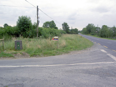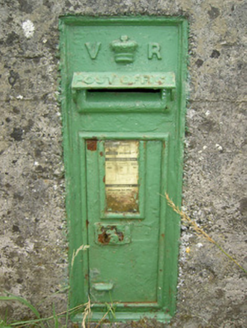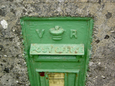 An attractive item of street furniture that represents an early surviving artefact of mass-produced cast-iron ware. The modest design of the box is enhanced by the royal cipher (identifying the reign of Queen Victoria between 1837 - 1901) and the crown motif, which enliven the appearance of this otherwise functional object. Many pre-independence post boxes were simply painted green and retained their royal insignia but are now becoming an increasingly rare sight and are worthy of retention as historical artifacts. Although the foundry mark is now illegible, it probably was cast by W. T. Allen and Company of London (1881-1955) who were responsible for many of the late-Victorian and Edwardian post boxes in North Leinster. This post box is sited at a prominent crossroads, which is a common site for post boxes for obvious reasons. It is still in service providing an important facility for the local community. It is sited at a crossroads close to the site of the local Roman Catholic church and school, these clustered amenities form a focal point for the outlying community. It was probably built into the rendered pier during the mid-twentieth century, but was originally located at this site (Ordnance Survey third edition six-inch map 1914).