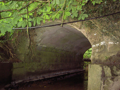 Single-arch road bridge over tributary of the Tang River, built c. 1860. Round-headed arch having rock-faced limestone voussoirs with dressed margins. Squared coursed rock-faced limestone spandrel walls, parapets and abutments. Squared dressed limestone masonry to barrel, recently repair with cement. Rounded cut limestone coping over parapets. Spans border with County Westmeath, and located to the southeast of Ballymahon. Possibly incorporates fabric of earlier bridge to site (to either end of parapet).