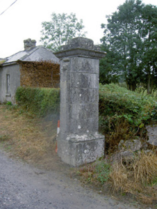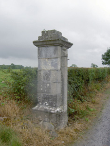 This imposing but elegant gateway is an important element of the built heritage of the Ballymahon area. The craftsmanship and quality of the stonework to the piers is of the highest standard and is of artistic merit. They survive in good condition and retain their early form and character. The style of the gate piers suggests that they date to the mid-to-late eighteenth century. The form and carved detailing to the piers is very similar to that found at a Clooncallow House (13402717), Creevaghmore (13402718) and at a secondary gate to Newcastle House (13402713), and it is possible that these gates at Cartron House formerly served another estate. Though no longer having its associated gates, this gateway must once have formed a prominent entrance to Cartron House to the south. This gateway forms a pair of related structures along with the attendant gate lodge (13402737) and adds interest to its pleasant rural location. Cartron House itself has historical connections with the Wright family from c. 1770 at the latest (a James Wright of Cartron died 1772 – will) until c. 1885. Lewis (1837) states that this was the home of a J. Wright, Esq. (Grand Juror of Longford in 1843), while the estate of an James S. B. (Simon Bradstreet) Wright of Cartron was some 236 acres in extent c. 1876. Cartron appears to have passed on a branch of the Slater family c. 1890, and was the home of an Arthur Slater in 1894 (Slater’s Directory).