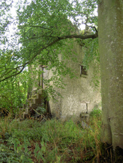 Detached single-bay three-storey building/structure associated with Clooncallow House (13402716), built c. 1820, having flight of cut limestone steps serving doorway at first floor to northeast elevation. Hipped or pitched natural slate roof, now collapsing. Roughcast lime rendered finish over random rubble limestone construction. Square-headed window openings to northwest elevation with tooled cut limestone sills, fittings now gone. Window opening at ground floor level now blocked. Square-headed door openings to ground (southeast) and first floors (northeast) with timber battened doors. Remains of painted plasterwork at ground floor level to interior. Located to west of Clooncallow House (13402716) and to the southeast of Ballymahon.