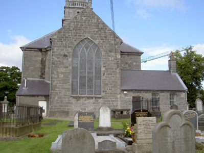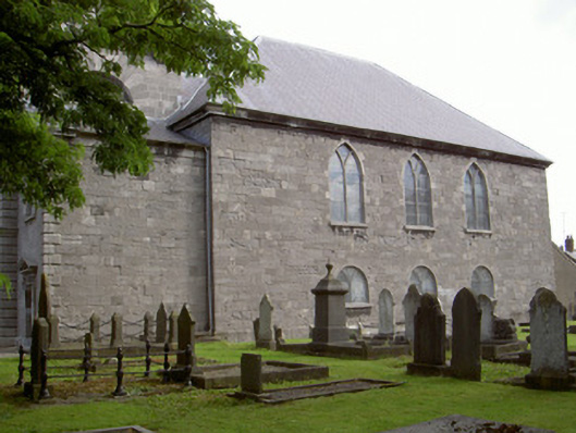 Freestanding Church of Ireland church, built 1748, by Hugh Darley. Three-bay two-storey nave, four-staged pinnacled tower surmounted by needle spire, c. 1780 by Francis Johnston, vestry to north-east. Hipped slate roof, lead hip and ridge flashing, cast-iron gutters on limestone carved corbelled eaves course, circular cast-iron downpipes, pitched slate roof, clay ridge tiles to vestry, ashlar limestone chimneystack, ashlar stone verge coping to gables. West elevation of ashlar limestone, central horizontally channelled limestone to entrance bay, rough ashlar limestone walling to all other elevations. Square-headed window openings to south elevation and vestry, limestone sills and painted timber six-over-six sliding sash windows to vestry, fixed nine-pane windows to south elevation with tooled limestone architrave, round-headed arched traceried opening to ground floor of nave, ashlar limestone surround and sills, pointed arch traceried windows to first floor, octagonal fixed lights, pointed arch window opening to east, stone tracery, stained glass light, Diocletian window to second stage of tower, round-headed opening flanked by pilasters and oculus to third stage, oculus to fourth stage. Main central round-headed opening, ashlar limestone doorcase surmounted by frieze, cornice and spoked fanlight, painted timber double doors with sixteen flat panels surmounted by eight panels, four of which are glazed, main entrance flanked by square-headed openings, ashlar limestone surround surmounted by frieze, cornice and pediment, painted timber doors with six flat panels; square-headed door opening to vestry, vertically-sheeted timber door, granite entrance platform to west accessed by limestone steps. Interior of church comprising gallery to west with pews dating to 1884, box pews to main church, c. 1865. Rococo style plasterwork to chancel with timber pulpit and prayer desk installed c. 1909. Number of memorial stained glass windows, east window to Saint George Smith dated 1873. Marble memorials affixed to walls of church. Medieval font to west of main church, octagonal in design comprising stages of shallow relief. Organ dated 1791, built by John Snetzler of London. Church is surrounded by graveyard with upright and incumbent grave markers, example being the white tombstone for John Duggan, a Private in the 17th Lancers and a survivor of The Charge of the Light Brigade at Balaklava. Random rubble stone wall to north, south and east of church, medieval carvings incorporated into wall, "cadaver stone" from tomb of Sir Edmond Goldyng and wife Elizabeth Fleming, comprising pair of skeletal remains surrounded by their shrouds. Rectory to north-west, Old School to south-west and former Sunday School building to west.