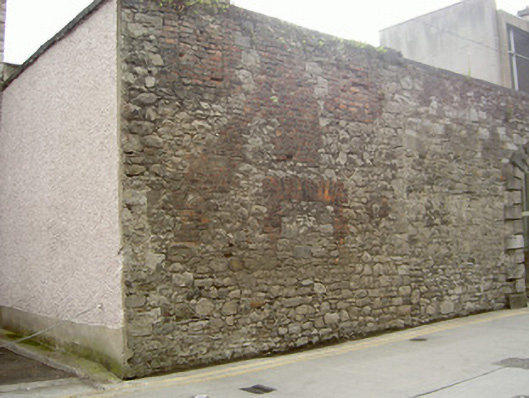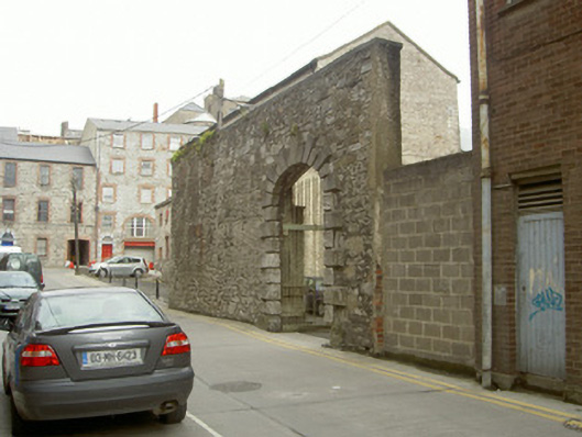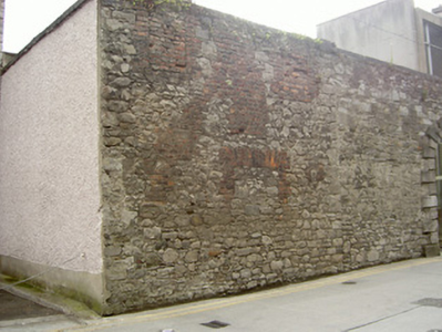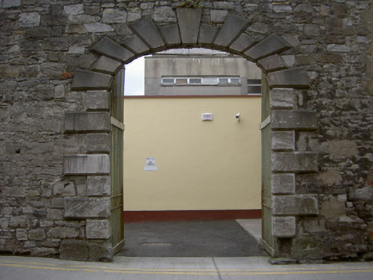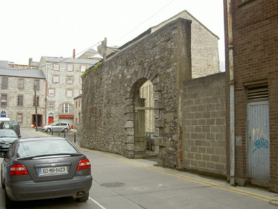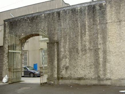 Attached stone wall and gateway, built c. 1760. Squared rubble stone wall, ashlar limestone coping, red brick infill to north end of west elevation, recent roughcast render to rear (east). Segmental-headed carriage arch to south of west elevation, tooled limestone block-and-start surround, recent metal gates. Carpark to east, fronts onto street to west.