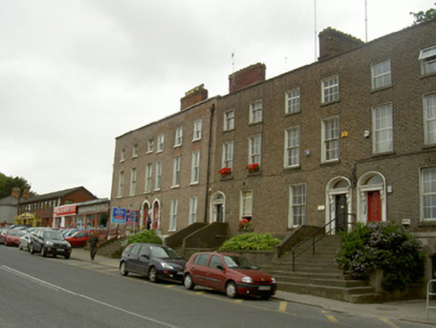 Terraced two-bay three-storey over basement former house, built c. 1830, now used as surgery. Pitched slate roof, clay ridge tiles, hidden by parapet, brick corbelled chimneystack, stone coping to parapet, cast-iron gutter bracketed to brick eaves corbel course, circular cast-iron downpipe to south elevation. Red brick walling laid in Flemish bond to upper storeys, painted random rubble and smooth rendered ruled-and-lined walling to basement and plinth course to north elevation, random rubble stone walling to south elevation. Square-headed window openings, painted smooth rendered patent reveals, tooled limestone stone sills, painted timber six-over-six sliding sash windows, three-over-six sliding sash windows to second floor, painted timber multiple-pane casement window to basement; red brick block-and-start surrounds to south elevation openings. Segmental-headed door opening, painted moulded smooth rendered surround, painted timber pilasters surmounted by scrolled console brackets support frieze, cornice and plain-glazed fanlight, painted timber door with two round-headed flat panels, entrance platform approached by twelve steps, flanked by smooth rendered ruled-and-lined plinth wall. House set back slightly from street, front site bounded by smooth rendered ruled-and-lined wall, basement accessed through cast-iron gate, flight of steps to basement.