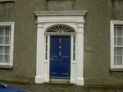 End-of-terrace three-bay two-storey former house, built c. 1840, now in use as veterinary surgery. Single- and two-storey flat-roofed extensions to rear c. 1960. Pitched slate roof, clay ridge tiles, unpainted smooth rendered corbelled chimneystacks, cast-iron half-round gutters on eaves corbel course, cast-iron downpipes. Unpainted pebbledash walling, smooth rendered V-jointed quoins and plinth. Square-headed window openings, painted moulded render surrounds, dressed limestone sills, painted ten-over-ten margined timber sliding sash windows. Elliptical-headed entrance door opening set in doorcase with dentilled cornice above plain frieze supported on Doric engaged pilasters, painted moulded render surround, painted timber door with six raised-and-fielded panels and brass furniture, flanked by slender sidelights each with three panes, spoked fanlight, single concrete threshold step. Street fronted, former Methodist church to north, terrace continues to south.