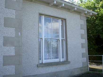 Detached five-bay single-storey house, built c. 1840. Rectangular-plan, paired hipped breakfronts containing box bay windows to east. Hipped slate roof, clay ridge and hip tiles, smooth rendered chimneystacks with paired sextuple corbelled flues on rectangular bases, overhanging eaves with timber sheeted soffit supported on carved timber brackets to rendered eaves course, moulded cast-iron gutters, square-profile downpipes. Unpainted pebbledash walling, unpainted smooth rendered block-and-start quoins and plinth. Square-headed window openings, smooth rendered soffits and reveals, granite sills, tripartite windows with painted timber two-over-two flanked by one-over-one sliding sash windows, painted timber casement windows to box bays. Segmental-headed door opening, smooth rendered reveals, painted timber raised-and-fielded four-panel door flanked by sidelights, timber tracery fanlight, approached by two granite steps. Set in own grounds; yard to west with outbuildings bounded by rendered wall, circular gate piers, wrought-iron gate; gravelled avenue from road to north-east, painted rendered quadrant gate screen walls terminating in cylindrical piers, wrought-iron gates.