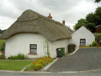 Semi-detached four-bay single-storey with attic thatched lobby-entry house, built c. 1780. Rectangular-plan, porch to south, extension to north. Suppressed-hipped thatched roof with scallop pinnings, scalloped ridge, eaves scalloped over porch, red brick corbelled chimneystack with concrete aprons; pitched concrete corrugated tile roof to extension, concrete ridge tiles, smooth rendered flat-capped chimneystack, uPVC half-round gutters bracketed to painted timber fascia board. Painted roughcast-rendered walling, smooth rendered plinth, smooth rendered ruled-and-lined walling to porch. Square-headed window openings, painted smooth rendered soffits and reveals, painted stone sills, painted timber top hung casement windows; moulded render kneed and lugged surrounds to south. Square-headed door opening to porch, painted timber half-door replacement with moulded panels to bottom half and glass panels to top half, name plaque over door. Set in own grounds, garden to south and north-west, concrete paved paths, carpark to north-east, bounded by painted roughcast-rendered wall with smooth rendered coping, entrances to south and east having square piers and painted timber gates.