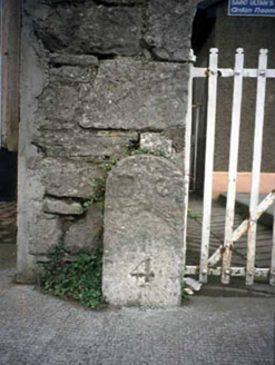 Freestanding inscribed cut-stone boundary stone, c.1840. Road fronted on concrete footpath. NOTE: The boundary stone is inscribed "BO/↑/4" and is the last of a set of six boundary stones originally marking the boundary of the Board of Ordnance-owned Navan Barracks. The positions of the boundary stones are shown on "NAVAN BARRACKS COUNTY OF MEATH" (1866) and, clockwise, included "BO/↑/1" near the north-east corner of the site; "BO/↑/2" and "BO/↑/3" on the east flank of the site; the surviving "BO/↑/4" at the south-east corner of the site; "BO/↑/5" at the south-west corner of the site and "BO/↑/6" at the north-west corner of the site [Military Archives of Ireland AD134730-005]. Navan Barracks was erected (1702) on the site of Saint Mary's Augustinian Abbey [SMR ME02-024----] and was 'adapted for 4 officers and 52 non-commissioned officers and privates, with stabling for 50 horses' (Lewis 1837 II, 421). The vacant Navan Barracks was sold (29th November 1912) to Navan Urban District Council [Military Archives of Ireland AD119302-009] and was subsequently adapted as Abbey School (1917-57).