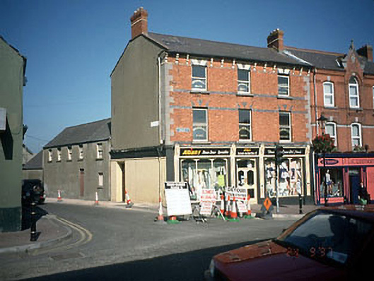 Corner-sited end-of-terrace three-bay three-storey house, built 1881. Polychrome brick façade with moulded brick eaves course and flush limestone quoins. Single-storey extension and two-storey return to rear. Shopfront refitted c.1985. Converted to retail outlet c.2000. Double-pitched roof, natural slates, uPVC gutters, brick chimney stacks. Red brick walls laid in Flemish bond, polychrome brick dressings, flush limestone quoins, nap rendered - side, moulded brick bracketed eaves. Limestone cills, single pane deal sash windows, full-width timber shopfront, c.1985, multi-paned timber sash windows and matchboard door to return. Detached single-storey open shed in rear yard with monopitch corrugated iron roof.