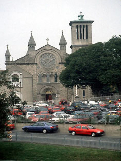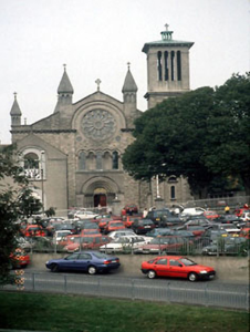 Detached gable-fronted church begun 1836, with five-bay side elevation to nave. Italianate-style belltower added c.1870. Entrance fronts extensively remodelled in 1885. Wrought-iron railings and presbytery to site. Double-pitched roof, natural slates, copper roof to bell tower. Coursed rubble limestone walls with ashlar dressings. To East - giant blind arcades frame large rectangular windows with semi-circular lights above. To North and South - Hiberno-Romanesque doorways and windows and Gothic-style rose windows - 1880's. Wall piers and cast-iron railings to Fair Green, frontage, wrought-iron decorative railings to flower beds and to stone steps up to presbytery adjoining.