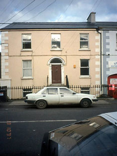 Semi-detached three-bay two-storey house over raised basement, c.1860, with round-headed door opening. Cast-iron railings to site. Double-pitched roof, artificial slates, projecting eaves, uPVC gutters, rendered chimney stack. Rendered ruled and lined walls, painted, raised quoins to left hand side. Stone cills, uPVC casement windows, round-headed door ope with moulded compo hood and remains of bracketed timber doorcase, two panel deal door. Cast-iron railings to basement area, limestone steps up to front door.