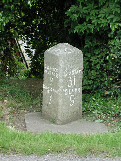 This milestone is a reminder of the great coaching era in Ireland when there was a coach based system of postal distribution. The simple form and carving of the structure is similar to other such milestones which are found in Meath, dating to the same period. The south side reads: 'Carrickmacross 9 miles, Kingscourt 6 miles'. The north side reads: 'Dublin 31 miles, Slane 9 miles'. The initials 'CM' carved into top of north and south sides of the milestone.