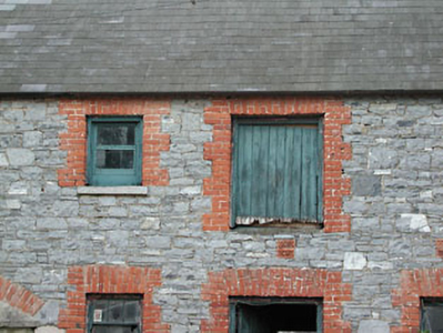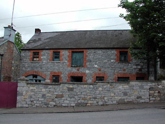 Detached six-bay two-storey building, built c.1860, now disused. Pitched slate roof with cast-iron rainwater goods and red brick chimneystacks. Squared rubble limestone walls. Timber sash windows with red brick surrounds and stone sills. Timber battened doors. Segmental-arched carriage arch with red brick dressings. Squared rubble limestone boundary wall.