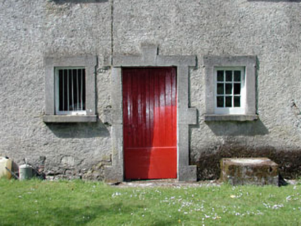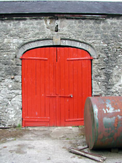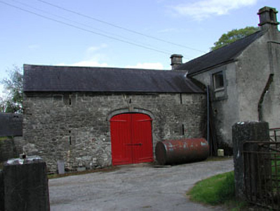 Detached three-bay two-storey roughcast rendered farm outbuilding, built c.1825, with recessed two-bay two-storey block to east. Segmental-arched openings to façade and return with cut stone arches and timber battened doors. Block-and-start door surround to with timber battened door. Cut stone surrounds to window openings. Pitched slate roofs with ashlar chimneystacks and bellcote. External steps to eastern extension.