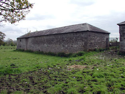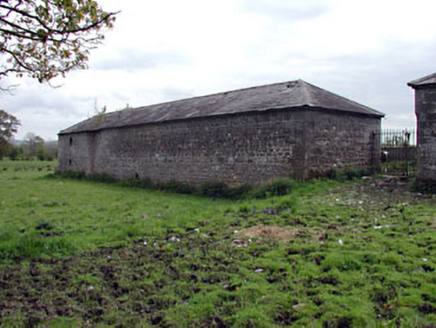 Three ranges of stone stables ranged around a courtyard, built c.1800, now in use as outbuildings. Round- and segmental-arched ashlar openings. Hipped slate roofs with terracotta ridge tiles.