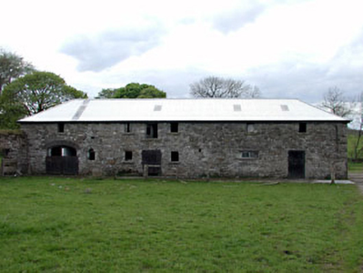 Detached seven-bay two-storey stone farm outbuilding, built c.1820, with segmental-arched integral arch having stone dressings. Square-headed opening with steel and timber battened doors. Stone sills to window openings. Modern hipped corrugated-metal roof. Yard to west is enclosed by rubble wall.