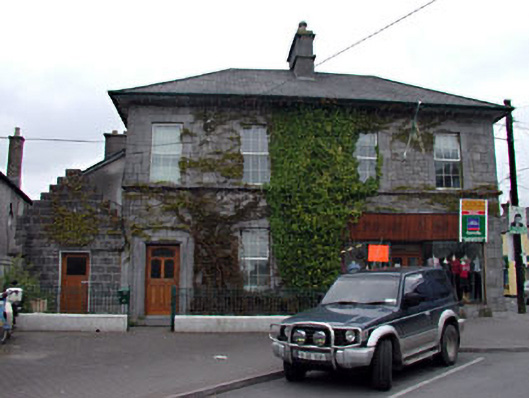 Pair of semi-detached two-bay two-storey houses, built c.1830. One of pair now also in use as shop. Hipped slate roof with carved timber eaves dentils and stone chimneystack. Windows openings have limestone tooled surrounds, sills to ground floor, and a continuous sill course to first floor. Carved stone doorcase, with cast-iron railings and gate to southern house. Two-bay shopfront inserted to ground floor, c.1970, to northern house, with single-storey return to rear, now also in use as shop. Crow-stepped gabled single-storey extension to southern house, with two-storey extension to rear. Rendered and stone outbuildings to rear.
