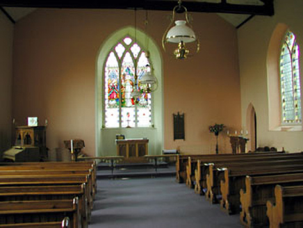 Detached Board of First Fruits church, built in 1816, with three-bay side elevations to nave and three-stage tower to east gable. Vestry attached to north-west corner. Pitched slate roof to nave, castellations and pinnacles to tower, with later addition of limestone ashlar spire and clock. Exposed stone to tower and entrance gable, roughcast-rendered to nave, with limestone quoins and string courses. Pointed arch stained glass windows with limestone reveals, sills and hood mouldings. Cast-iron bootscraper to entrance door.