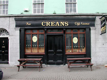 End-of-terrace double-pile four-bay three-storey rendered house, built c.1840, now also in use as public house. Limestone ashlar to ground floor with pair of carved pilasters, and string course above. Timber shopfront with fluted pilasters, decorative console brackets, plain fascia and timber panelled door. Timber panelled door with petal fanlight above. Timber sash and uPVC windows with stone sills. Pitched tile roof with ashlar stone and cement-rendered chimneystacks. Built as pair with house to north. Derelict stone outbuildings to rear.