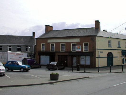 End-of-terraced five-bay two-storey house, built c.1875, with vacant shop units to ground floor. Recessed bay to east with integral carriage arch having cut stone voussoirs. Channelled render and remains of original shopfront to ground floor. String course at sill level to first floor, having rendered name panel and eaves course above. Window openings to first floor have moulded architraves, rendered sill course and replacement timber windows. Pitched slate roof with rendered chimneystacks.