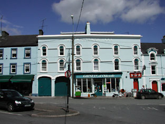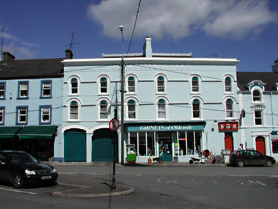 This imposing terraced house is one of the most dominant buildings in Oldcastle. The scale, elaborate render detailing, well maintained façade, and the ornate ridge cresting of the building are immediately engaging. The architectural and artistic qualities of this building make an interesting contribution to the market square. The frieze reads: 'Established in 1862'.