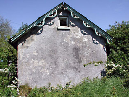 Detached five-bay single-storey former teacher's house, with attic accommodation, built c.1860, now derelict. Rendered walls. Pitched slate roof with red brick chimneystack and carved timber bargeboards to gable ends. Timber sash windows with render surrounds and stone sills. Projecting porch with cornice and timber panelled door flanked by sidelights. Some interior features remain. Stone outbuilding to site. Bounded by rendered walls having stone gate piers with cast-iron gates.