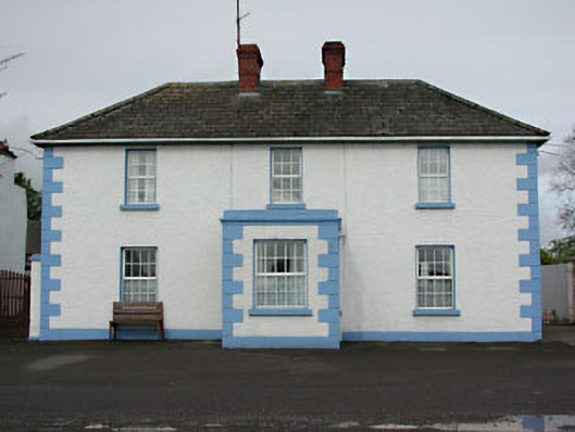 Detached three-bay two-storey house, built c.1820, with central porch. Roughcast rendered walls with render quoins. Hipped tile roof with red brick chimneystacks. Square-headed window openings with stone sills. Barrel-roofed corrugated-iron outbuilding to rear.