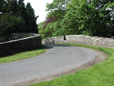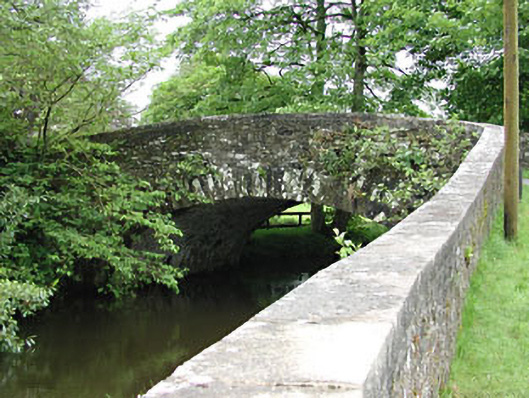 Single-arch road bridge over river, built c.1780. Rubble limestone walls with roughly dressed voussoirs and ashlar coping. Pedestrian refuge in the form of a stone seat built into parapet wall.