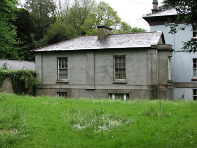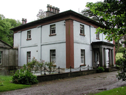 Detached three-bay two-storey over concealed basement house, built 1825. Limestone Doric porch approached by limestone steps. Hipped slate roof with timber brackets to eaves and rendered chimneystacks. Rendered walls with full height pilasters supporting blank frieze. Timber sash windows and stone sills. Timber glazed door with timber sash sidelights. Single-bay single-storey over basement wing to north-west, with pediment and full-height canted bay. Stone outbuildings ranged around courtyard to rear.