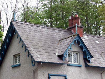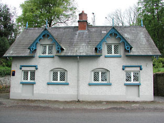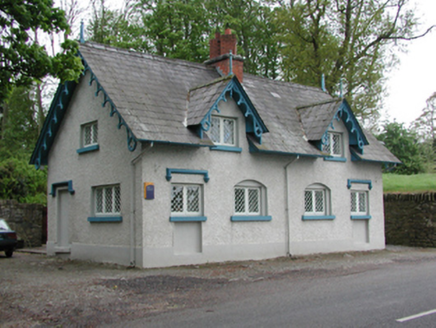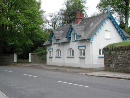 Pair of semi-detached two-bay two-storey former gate lodges, built c.1825, now in use as a detached private dwelling. Roughcast rendered walls. Pitched slate roof with terracotta ridge cresting and angled brick chimneystacks. Carved timber bargeboard with finials to gables and dormer windows. Diamond pane windows with stone sills, having recessed panels, two with label mouldings to ground floor.