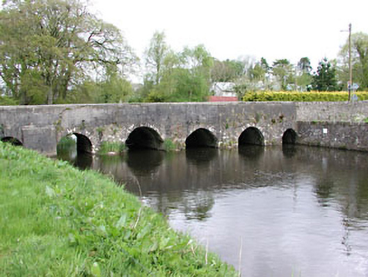 Six-arch road bridge, c.1750. Rendered rubble limestone walls with roughly dressed stone arch ring. Upstream side of bridge has triangular cutwaters. One cutwater is full-height and originally was a pedestrian refuge.