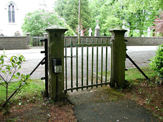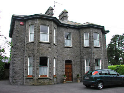 Detached three-bay two-storey presbytery, built c.1920, with full-height canted bay windows flanking entrance door. Hipped slate roof with ashlar chimneystacks. Snecked rock-faced limestone walls. Timber sash windows set in segmental-arched openings with stone sills. Extended to rear. Outbuildings to site. Octagonal stone gate piers with cast-iron gate.