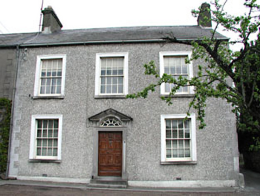 End-of-terrace three-bay two-storey house, built c.1780. Pitched slate roof with rendered chimneystacks. Roughcast rendered walls with tooled stone quoins. Rendered architraves with timber sash windows. Pedimented stone doorcase with lugged surround and original decorative fanlight, approached by flight of stone steps with cast-iron bootscraper.