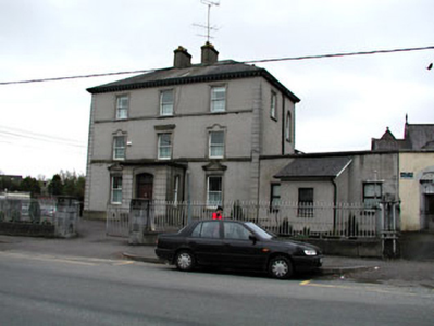 Detached three-bay three-storey parochial house, built c.1890, with central flat-roofed porch. Hipped tile roof with rendered chimneystacks and eaves dentils. Rendered walls with string courses and channelled quoins. Channelled render to porch. Decorative render surrounds to timber sash windows. Limestone piers and cast-iron railings to site. Modern single-storey extension to west.