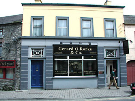 Terraced four-bay two-storey commercial building, built c.1900. Pitched slate roof hidden behind parapet with rendered chimneystacks. Rendered walls with string course at sill level to first floor, and with channelled door surround to ground floor. Rendered architraves to window openings on first floor. Pair of timber panelled doors with cast-iron overlights to terminating bays.