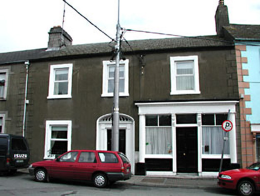 Terraced three-bay two-storey house, built c.1850, with disused shopfront. Pitched tile roof with rendered chimneystacks. Rendered walls with render quoins. Stone surrounds and sills to window openings, with cast-iron window guard to ground floor. Stone segmental-arched doorcase, with original teardrop fanlight, pilasters, cornice and timber panelled door. Timber shopfront comprising of timber panelled door flanked pilasters with carved brackets, having fixed display windows, terminated by fluted columns, with fascia above. Built as a pair with the house to the west.