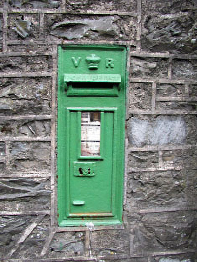 Wall-mounted cast-iron "wall box" post box, extant 1954, with "VR [Victoria Regina]" royal cipher. Set in repointed snecked limestone wall.