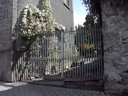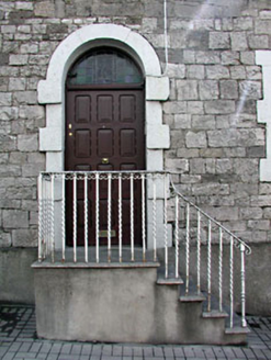 Semi-detached four-bay two-storey house, built c.1760, with a two-storey return to rear. Exposed stone wall to front elevation, and roughcast rendered walls to gable end and rear elevation. Pitched slate roof with rendered chimneys and cast-iron rainwater goods. Tooled limestone round-headed block-and-start door surround with a stained glass fanlight and approached by flight of steps with wrought-iron railings. Pair of cast-iron gates leading to four-bay two-storey outbuilding with integral carriage arch.