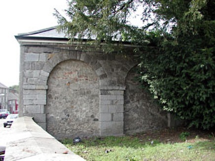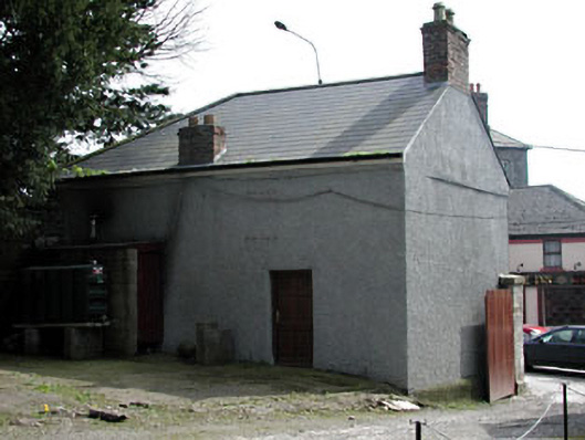 Detached three-bay two-storey former outbuilding, built c.1760, now in use as a house. Hipped slate roof with two original red brick chimneystacks. Roughcast rendered walls, with stone wall to east gable, having a cut stone blind arcade. Stone piers on the west gable end. Linked to the formerly related main house by a screen wall.