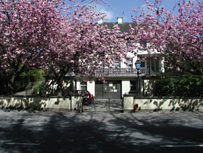 Detached six-bay three-storey Garda Síochána station, built c. 1950, comprising of office accommodation to ground floor, with pair of residences above. The two residences are accessed by steps to first floor level leading to a veranda. Roughcast rendered walls. Pitched tile roof with two chimneystacks and over sailing eaves. Curvilinear porch canopies to recessed entrances. Timber sash windows. Circular window to side elevations. Roughcast rendered boundary walls with steel gates.
