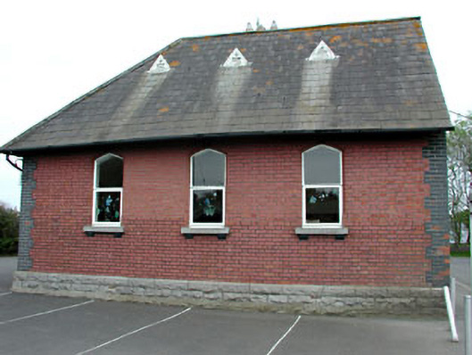 Detached six-bay single-storey former school, built c.1873, with central bays flanked by projecting gabled bays with entrance porches. Red brick walls with brick quoins and stone plinth course. Pitched slate roof with timber vents and red brick chimneystacks. Lancet and segmental-arched window openings. Three limestone plaques to front elevation. Now in use as community centre.