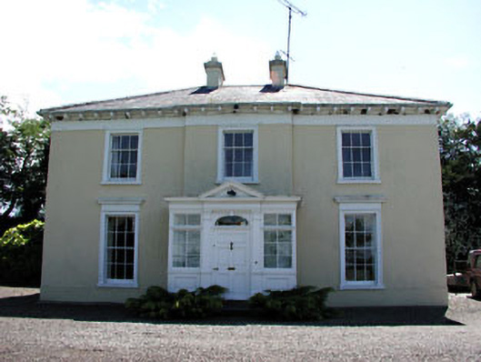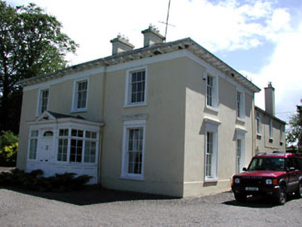 Detached three-bay two-storey house, built c.1860, with central breakfront. Timber and glazed pedimented central porch addition to front elevation. Hipped slate roof with rendered chimneystacks, eaves dentils and cast-iron rainwater goods. Timber sash windows with limestone sills and render surrounds. Modern extension to rear. Front site is enclosed by wrought-iron railings and gates.