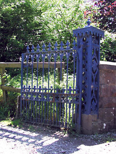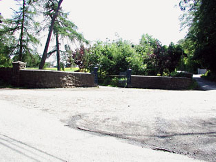 Limestone ashlar walls and piers with pair of square-profile cast-iron piers and double gates, c. 1860. Wheel guards to site