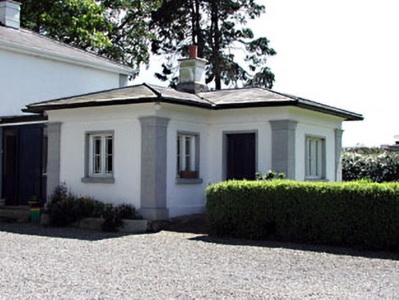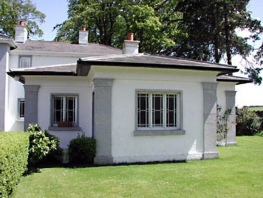 Detached two-bay single-storey former gate lodge, built c.1820, now in use as a private dwelling. Hipped slate roof. Rendered walls with limestone pilasters at corners. Tooled limestone surrounds and sills with paired and triple cast-iron casement windows having timber mullions. Timber door panelled door. Two-storey modern extension.