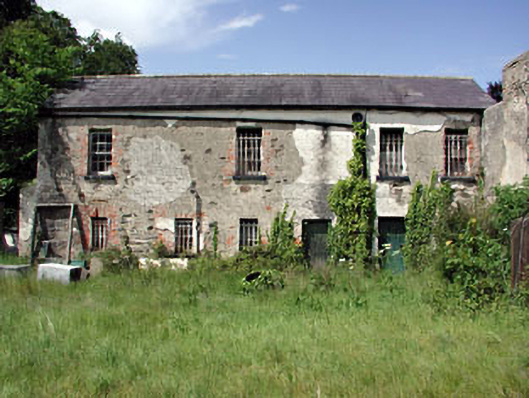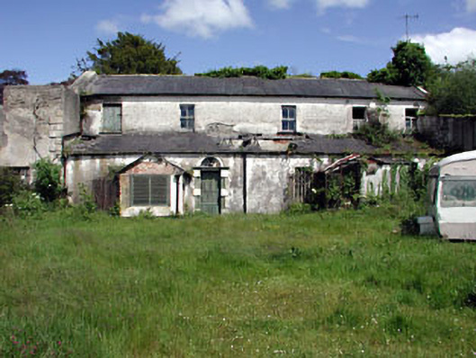 Detached five-bay two-storey building, built c.1760, set within a courtyard. Pitched slate roof. Rendered walls. Timber sash windows. Round-arched door opening with a block-and-start stone surround, spoked fanlight and panelled timber door. Outbuildings of similar scale and materials to courtyard. Carriage arch opening with castellations to the north side of courtyard.