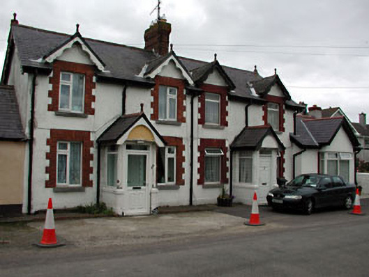 Pair of semi-detached three-bay two-storey houses, built c.1890, with gabled central porches. Pitched slate roofs with gabled dormers, terracotta ridge tiles and finials, red brick chimneystack, and decorative bargeboards. Rendered walls. Red brick dressings and tooled stone sills to window openings. House to east has a single-bay extension to east.