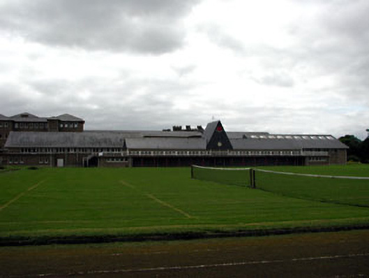 Detached multiple-bay single-storey sports pavilion, built c.1956, with central projecting clock tower over entrance doors, and flanked by projecting sports halls. Pitched artificial slate roof. Pebbledash rendered walls with concrete panels. Pair of paired doors with a concrete canopy and surround forming the entrance. Cast-iron pivot windows set in groups of three with dividing concrete piers at clerestorey level. Viewing gallery to north elevation overlooking playing fields.
