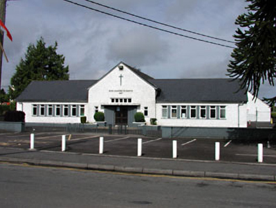 Detached T-plan national school, built in 1949. Gable-fronted double-height three-bay entrance block, flanked by seven-bay single-storey blocks. Pitched artificial slate roofs. Roughcast rendered walls with brick plinth, metal lettering and crucifix to facade. Replacement windows with brick surrounds. Timber glazed double doors with brick surrounds and concrete canopy above. Rendered boundary walls with railings and gates.